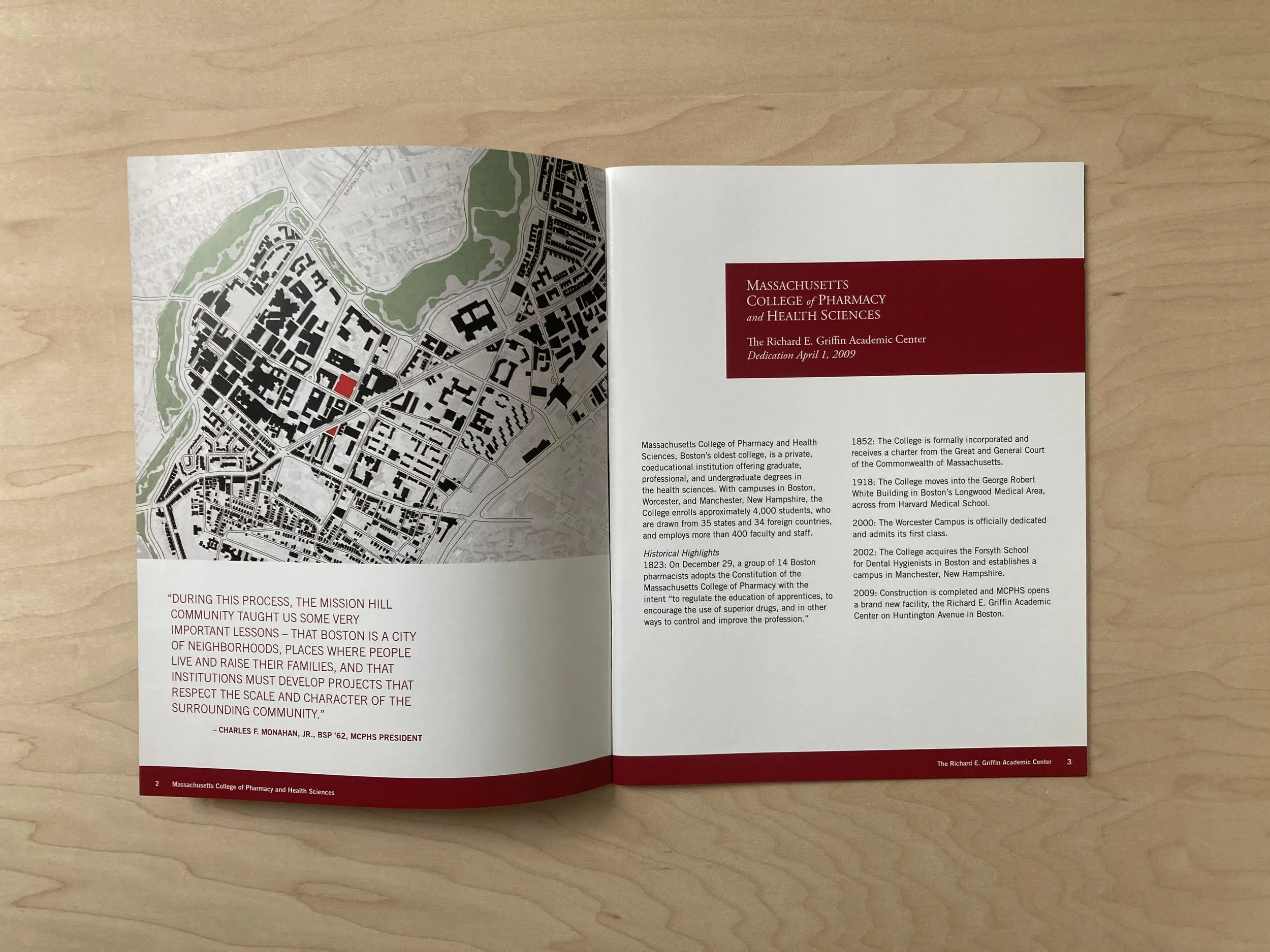 Catalog created for Perkins+Will, an architecture firm located in Boston, Massachusetts. The catalog highlighted the design of the Massachusetts College of Pharmacy and Health Sciences building, The Richard E. Griffin Academic Center.